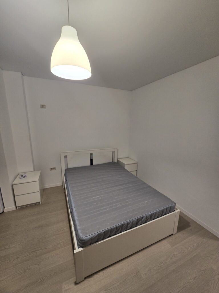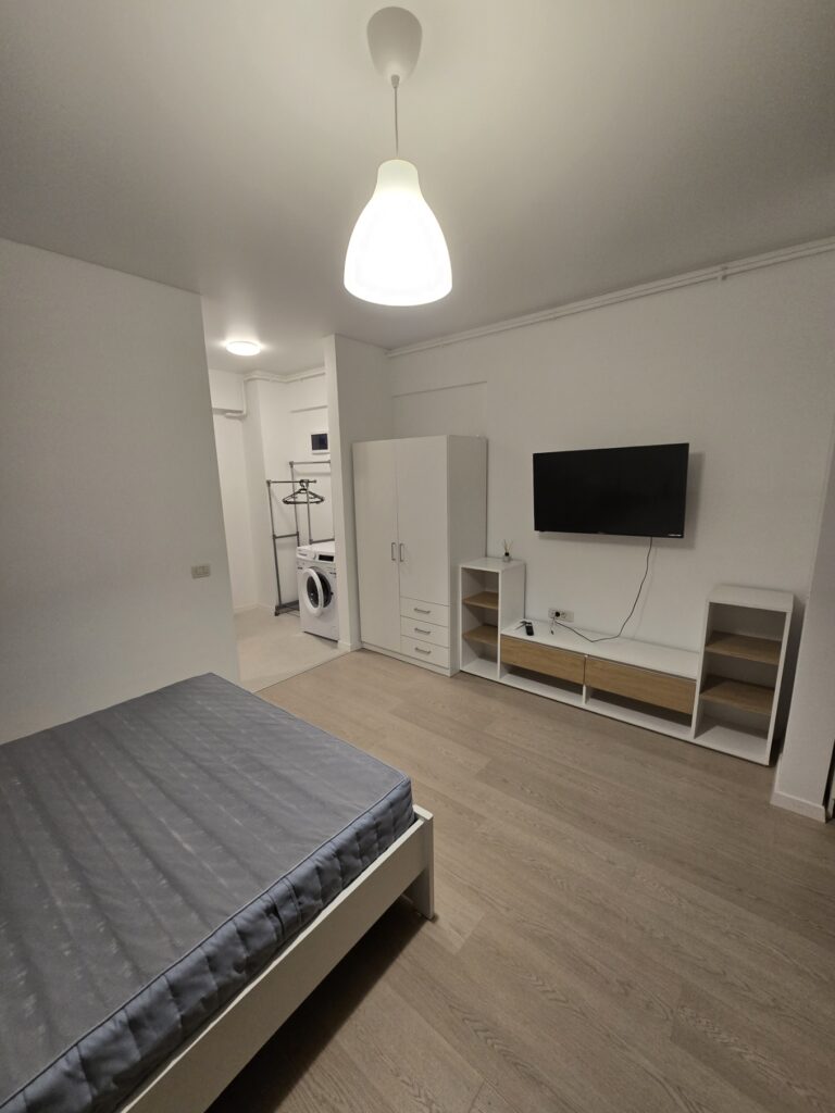 Zona de living/dormitor: Mobilată cu un pat matrimonial generos, noptiere, un dulap încăpător pentru haine și o unitate media modernă cu TV inclus. Parchetul deschis și pereții albi amplifică lumina naturală.