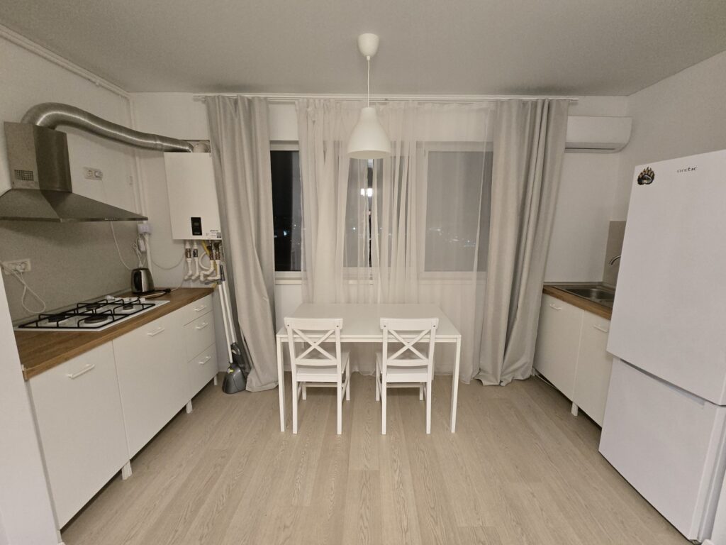 Bucătărie separată/Dining: Complet mobilată și utilată, dotată cu plită pe gaz, hotă, frigider încăpător și masă de dining cu două scaune. Aici se regăsește și centrala termică proprie, asigurând controlul total asupra costurilor de încălzire.