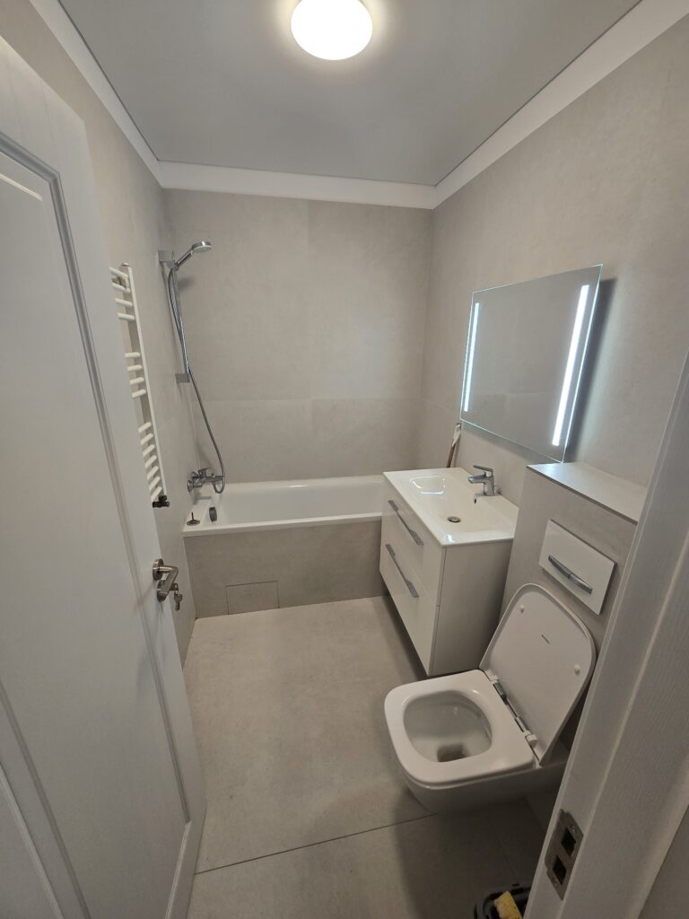 Baie modernă: Finisată cu plăci ceramice în tonuri calde de gri, dotată cu cadă, lavoar cu sertare pentru depozitare și o oglindă cu iluminare LED integrată.